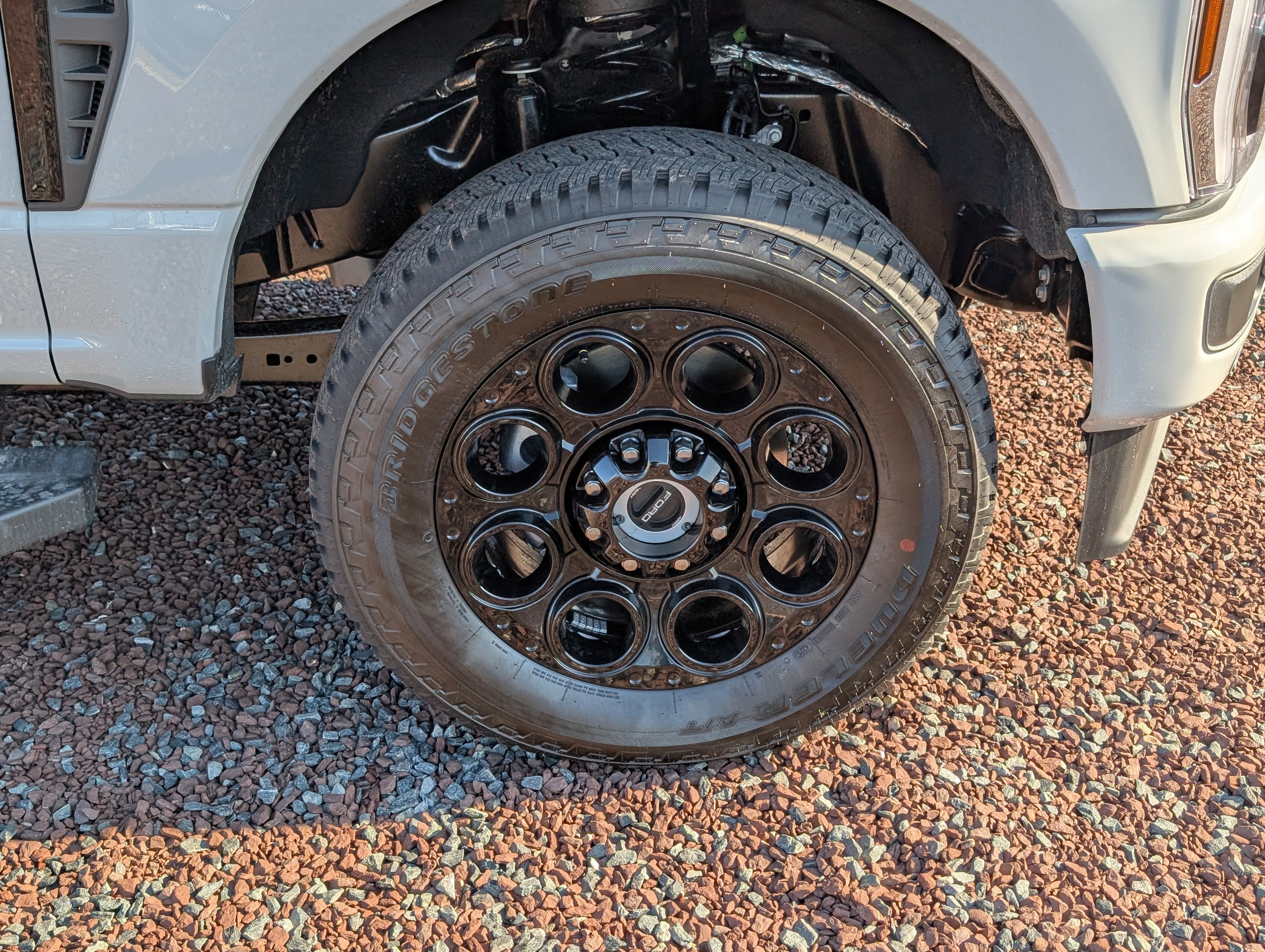 - BLACK APPEARANCE PACKAGE -inc: front and rear black Ford ovals box side decal (4x4 FX4 or Tremor) and ebony black fender vent surround dark fender badge Rear Wheel Well Liners Black Painted Front Grille Surround Ebony Black Painted Mirror Caps Tough Bed Spray-In Bedliner tailgate-guard black box bed tie-down hooks and black bed attachment bolts Body Color Front & Rear Bumpers Wheels: 20 Ebony Black High Gloss Black premium painted aluminum gloss black hub cover/center ornament Tires: LT275/65Rx20E BSW A/T Spare may not be the same as road tire 6 Ebony Black Angular Running Boards